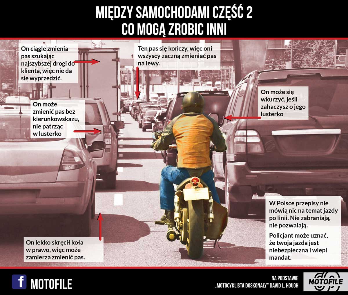 Nie ma znaczenia, czy jedziemy po linii między samochodami, czy też za ruszającym i zatrzymującym się co chwilę sznurem samochodów. Wystarczy sekunda nieuwagi, by wpaść w tarapaty i wylądować w szpitalu ze zmiażdżonymi kończynami. Jazda po zakorkowanych ulicach jest dla motocyklisty ryzykowna niezależnie od tego, czy samochody masz po bokach, czy przed sobą i z tyłu.