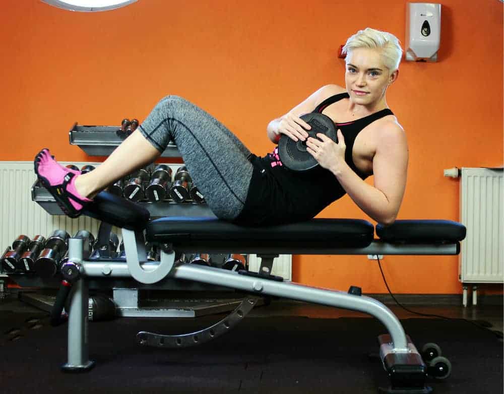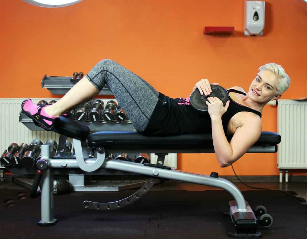 Porządny zestaw ćwiczeń na siłownię nie może się obejść bez brzuszków. Przy tym ćwiczeniu wzmacniamy mięśnie brzucha – prosty i skośny zewnętrzny. Połóż się na ławeczce (może być ustawiona poziomo lub delikatnie opuszczona, by głowa była poniżej tułowia). Nogi ugnij w kolanach pod kątem 90 stopni. Stopy oprzyj o podnóżki i pilnuj, by się nie ruszały. W opcji bez obciążenia – skrzyżuj ręce na klatce piersiowej, z obciążeniem – trzymaj przy klatce piersiowej talerz od sztangi. Unoś tułów, stopniowo skręcając go. Wróć do pozycji leżącej. Wykonuj skręty tułowia naprzemiennie – raz patrząc w lewo, raz w prawo.
