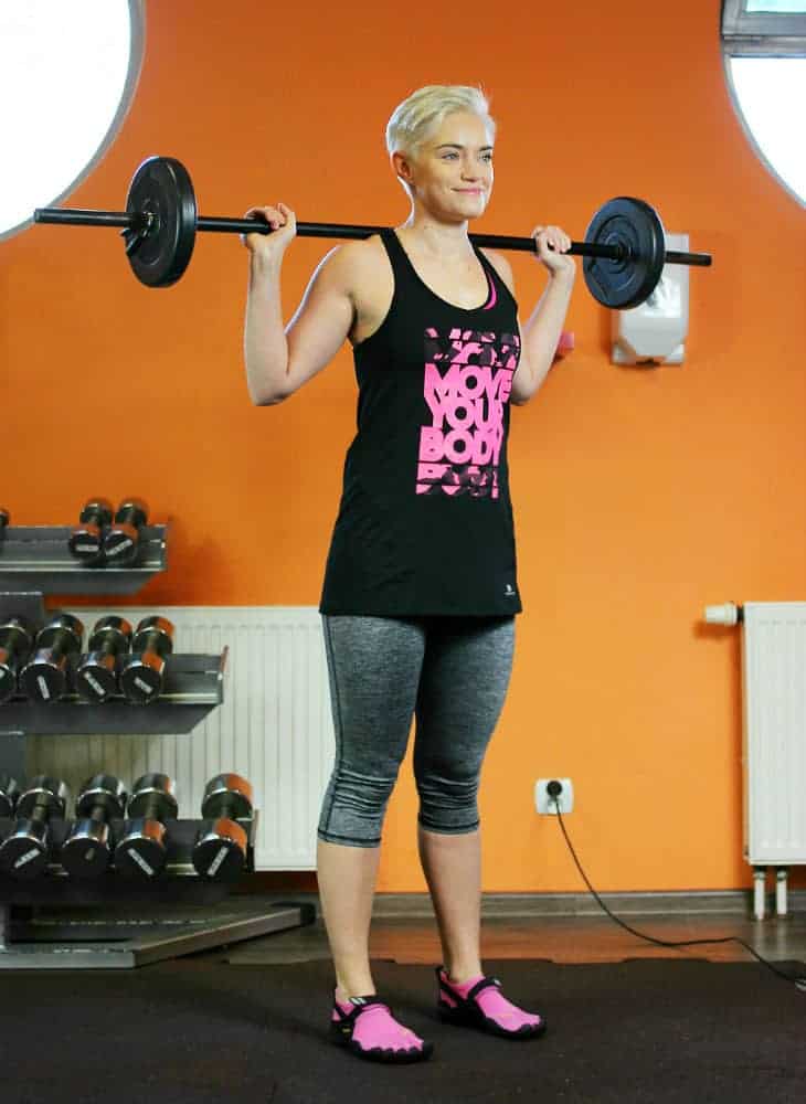 Przysiad możesz pogłębiać aż do pięt, jednak nie rób go na siłę. Słuchaj ciała, pamiętaj o prostych plecach i schodź ze sztangą dokąd możesz zachować poprawną linię sylwetki. Zwróć uwagę, by kolana były skierowane do przodu i nie przekraczały linii palców stóp. Unosząc się w górę rób mocny wydech – to da ci siłę.
