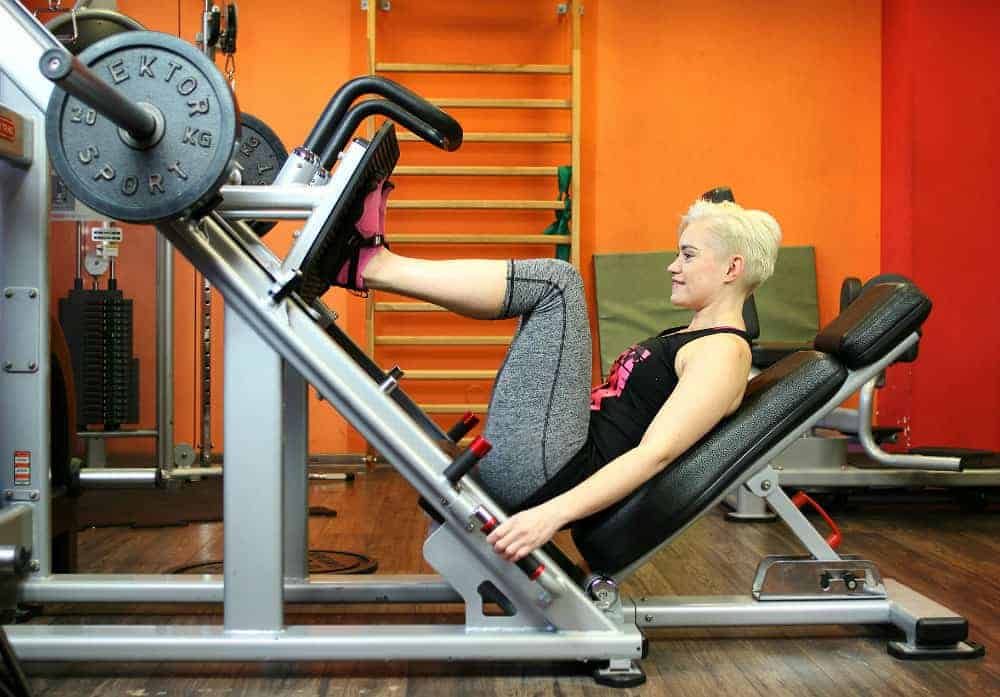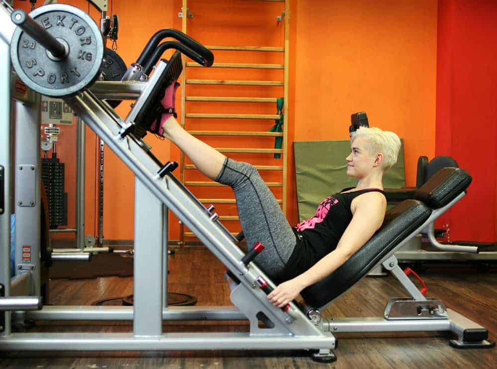 Nadal wzmacniamy mięśnie pośladkowe, czworogłowy uda i łydki. Ćwiczenie należy do łatwiejszych. Połóż się na ławce, stopy ustaw do spodu platformy. Ustaw je na szerokość bioder, równolegle do siebie. Im wyżej je ustawimy, tym mocniej zaangażujemy mięśnie pośladkowe. Ważne, by robić to ćwiczenie spokojnie, nie odrywać stóp od platformy. W momencie wypchnięcia nogi powinny być lekko ugięte – kolana nie mogą być zablokowane. Platforma nie może podskoczyć w najwyższym punkcie, bo może dojść do nadwyrężenia kolana. Z kolei w najniższym punkcie, kolana powinny być nie niżej niż 20 cm nad klatką piersiową. Kiedy leżysz na suwnicy, kontroluj, czy kolano i stopa poruszają się w jednej prostej linii.