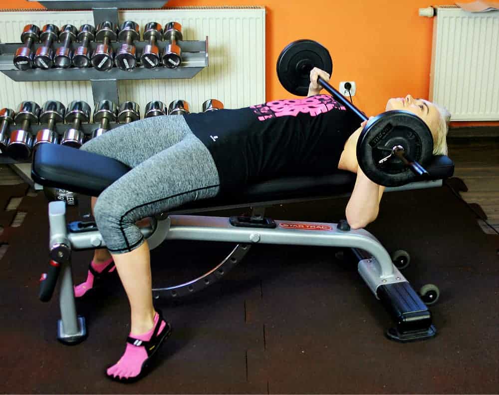 W tym ćwiczeniu pracujemy mięśniami piersiowymi i tricepsem. Przy wyciskaniu dużego ciężaru potrzebujesz wsparcia drugiej osoby, która poda ci sztangę, będzie asekurować w trakcie i odbierze gryf po wykonaniu ćwiczenia. Chwyć sztangę tak, by dłonie były ułożone na szerokość barków jak najbliżej klatki piersiowej. Opuszczając sztangę pamiętaj, by łokieć był blisko tułowia, w jednej linii z nadgarstkiem. Ruszaj tylko rękoma, pracuj klatką piersiową i tricepsem, nie odrywaj pośladków, ani kręgosłupa od ławeczki.